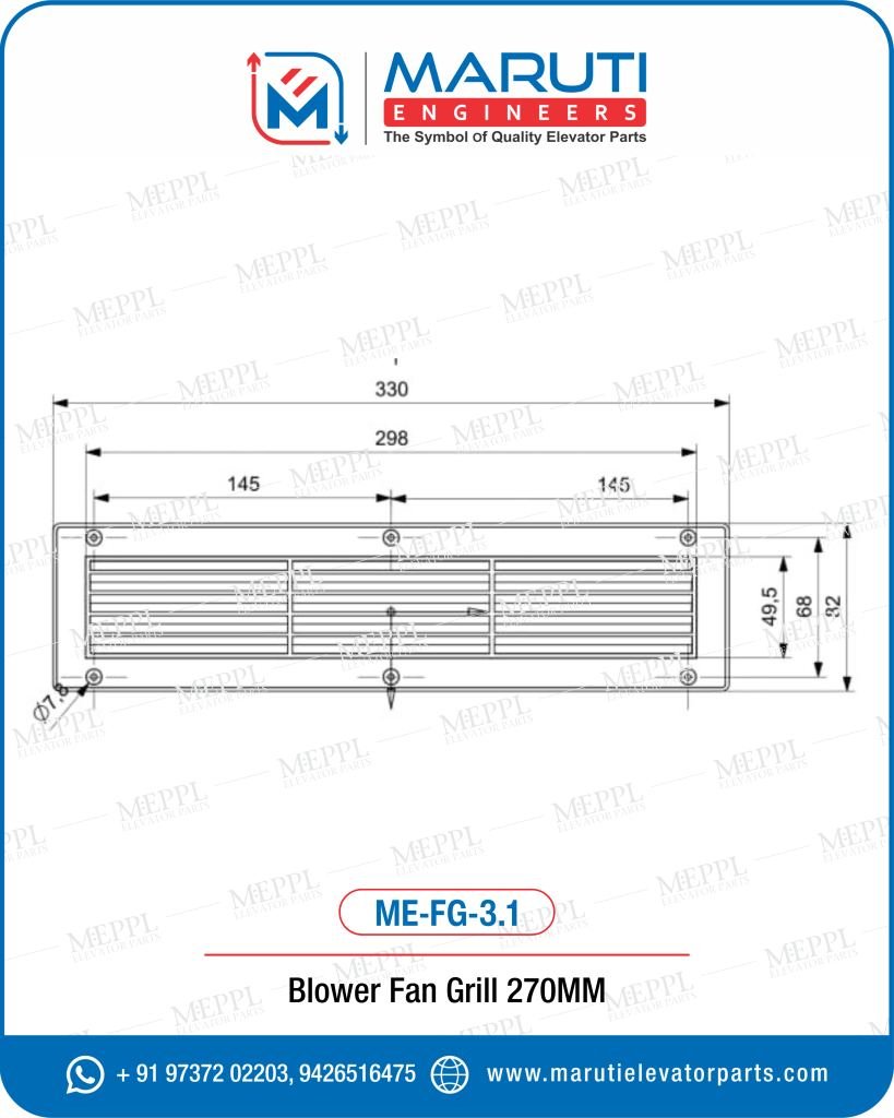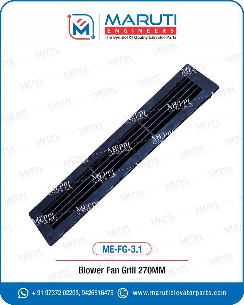 The MEPPL Blower Fan Grill is a high-quality protective accessory designed for elevator cabin blower fans, available in 270MM and 330MM sizes. Engineered for all-direction airflow, these grills ensure optimal ventilation inside the cabin while protecting the fan blades from dust, debris, and accidental contact. Made from durable, corrosion-resistant materials, the grills are lightweight, sturdy, and easy to install on ceiling or side-mounted blower fans. Compatible with plastic and metal blade blower fans, the all-direction airflow design guarantees uniform air circulation, enhancing passenger comfort and extending fan life. With over 25 years of industry experience, Maruti Engineers (MEPPL) provides reliable elevator components and accessories, combining safety, durability, and efficient performance for all types of modern elevators.