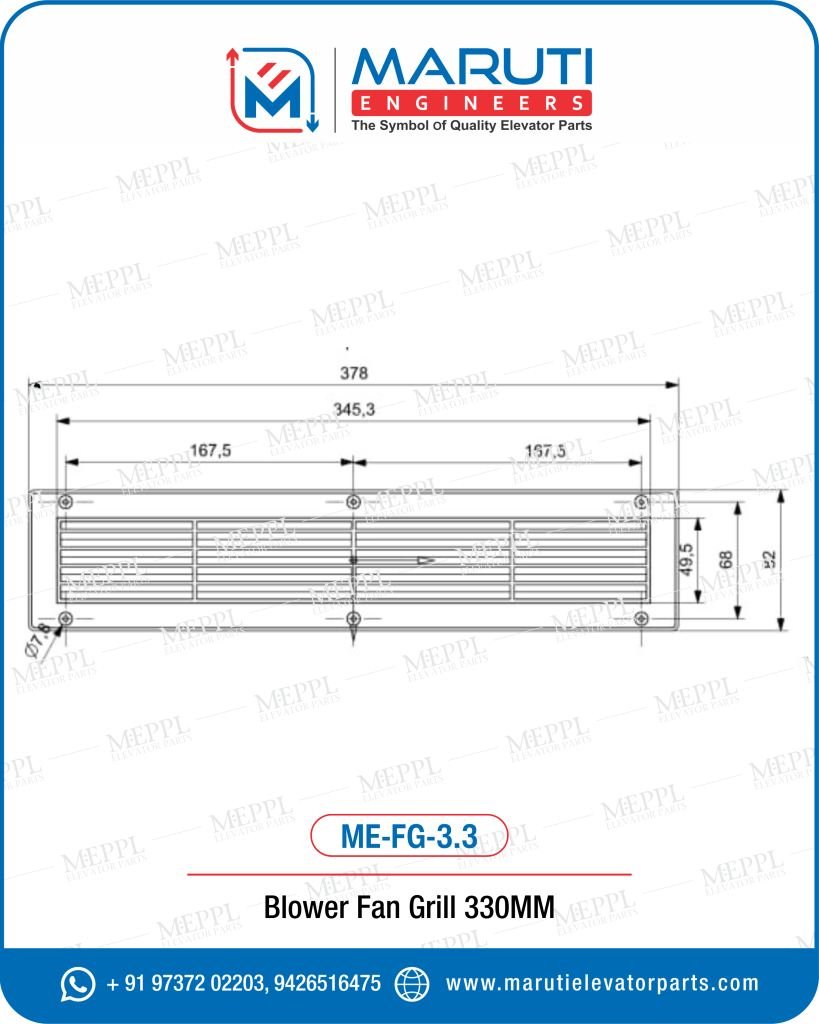 The MEPPL Blower Fan Grill is a high-quality protective accessory designed for elevator cabin blower fans, available in 270MM and 330MM sizes. Engineered for all-direction airflow, these grills ensure optimal ventilation inside the cabin while protecting the fan blades from dust, debris, and accidental contact. Made from durable, corrosion-resistant materials, the grills are lightweight, sturdy, and easy to install on ceiling or side-mounted blower fans. Compatible with plastic and metal blade blower fans, the all-direction airflow design guarantees uniform air circulation, enhancing passenger comfort and extending fan life. With over 25 years of industry experience, Maruti Engineers (MEPPL) provides reliable elevator components and accessories, combining safety, durability, and efficient performance for all types of modern elevators.