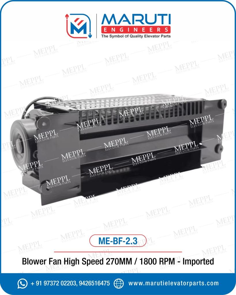 The MEPPL Elevator Blower Fan (270MM Air Flow Cutting Size / 1800RPM) is a premium imported cooling fan designed for elevator cabins, ensuring consistent ventilation and superior passenger comfort. With a 270mm airflow cutting size and a high-performance 1800RPM motor, this fan provides powerful air circulation while maintaining quiet and smooth operation. Equipped with aerodynamically designed plastic blades, the blower delivers efficient airflow, low vibration, and energy-saving performance. Its compact size and balanced design make it ideal for installation in elevator cabin ceilings or side panels, keeping the cabin fresh during continuous elevator use. Manufactured and supplied by Maruti Engineers (MEPPL) — a trusted brand since 1996 — this fan represents reliability, quality, and engineering precision trusted by elevator manufacturers and maintenance professionals across India.