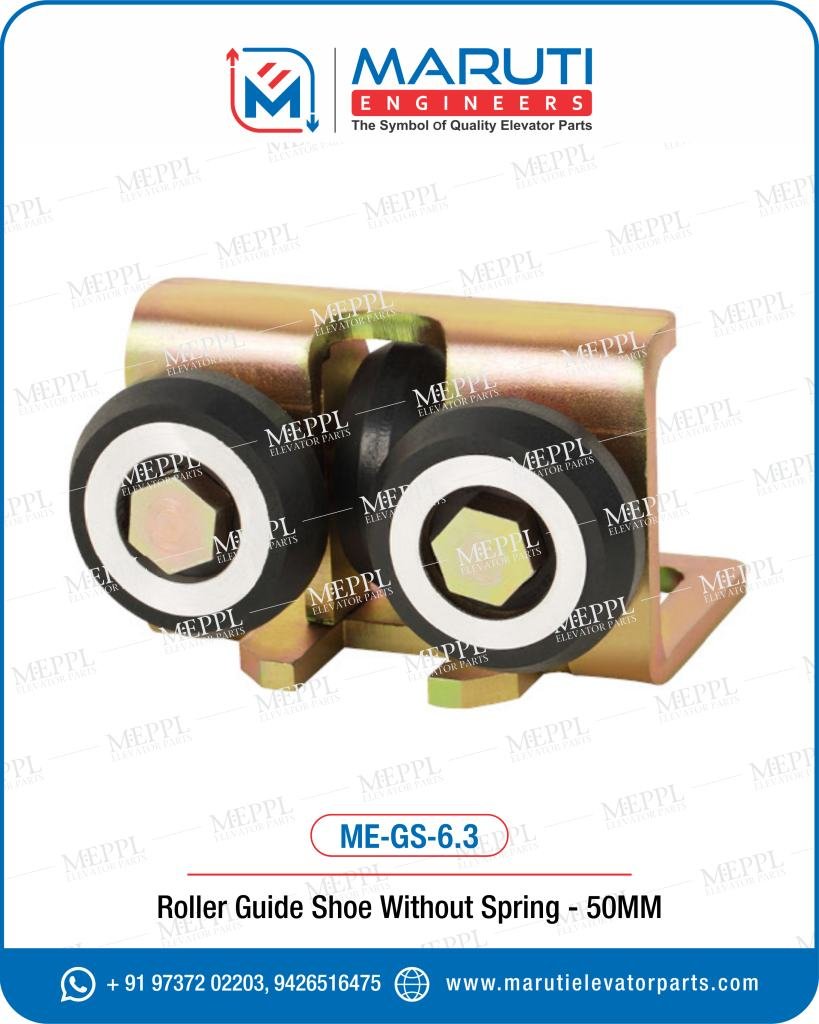 The MEPPL Roller Guide Shoe, manufactured by Maruti Engineers, is designed to ensure smooth, quiet, and stable elevator car movement by guiding the elevator along the rails. Ideal for high-speed and high-rise elevator systems, this guide shoe minimizes vibration and noise, enhancing ride comfort and safety. Crafted using premium-grade steel and high-durability polyurethane rollers, our roller guide shoes are available in multiple sizes and configurations to suit various elevator car and counterweight applications. The self-aligning design ensures precise rail tracking and reduces wear on both the guide rail and shoe components. With in-house production capabilities and over 25 years of experience, Maruti Engineers delivers industry-standard, high-performance elevator spare parts under the MEPPL brand — trusted by OEMs, installers, and service providers across India and abroad.